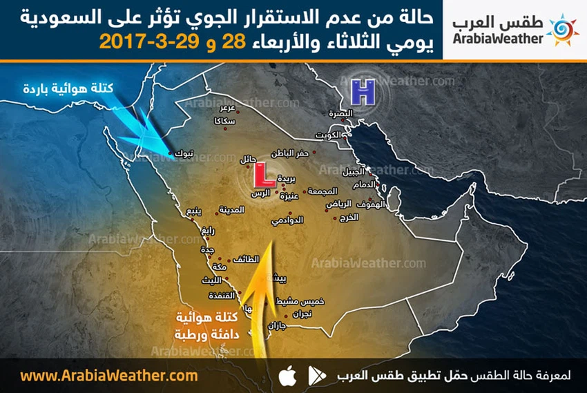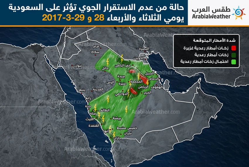 هذه الظروف الجوية من شأنها أن تعمل على نشوء اضطراب جوي على نطاق واسع من جنوب غرب المملكة وصولاً الى شمال شرقها (وتشمل المنطقة الوسطى بما فيها الرياض)، وبالتالي نشوء السحب الركامية الماطرة والتي قد ترافق مع نشاط على حركة الرياح وربما اثارة الغبار في بعض المناطق، كما تتساقط زخات الأمطار تكون رعدية الطابع متوسطة الشدة الى غزيرة أحياناَ.