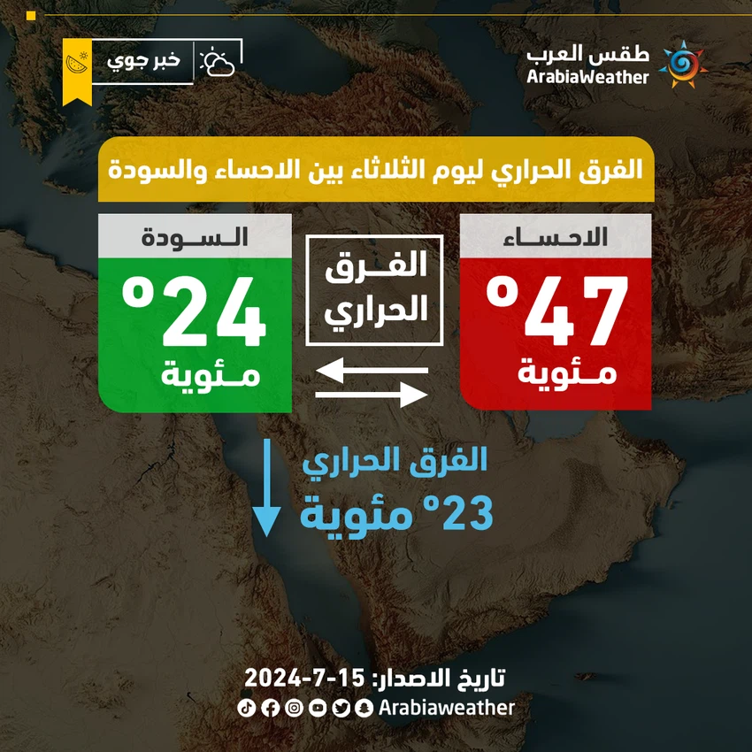 ويُتوقع أن تصل درجات الحرارة العظمى يوم الثلاثاء إلى نحو 47 درجة مئوية في الإحساء، في حين تكون بحدود 24 درجة مئوية في السودة، أي بفارق حراري يبلغ 23 درجة مئوية.