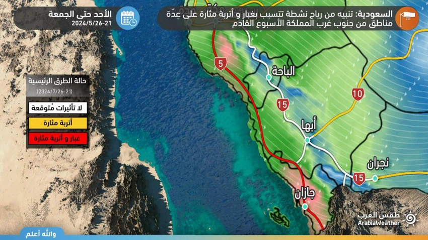 قال المُختصون في مركز طقس العرب بأنه يُتوقع أن ينخفض الضغط الجوي الأسبوع القادم جنوب البحر الأحمر مما يساعد في نشاط الرياح الشمالية الغربية المُثيرة للأتربة و الغبار و تحرك كتل الغبار من شرق السودان عبر مياه البحر الأحمر على طول سواحل و تهامات مناطق جازان و عسير و صولاً لجنوب مكة المكرمة، و يؤدي ذلك إلى تدني مدى الرؤية الأفقية و رُبما شبه انعدامها في المناطق المفتوحة و الطرق السريعة.