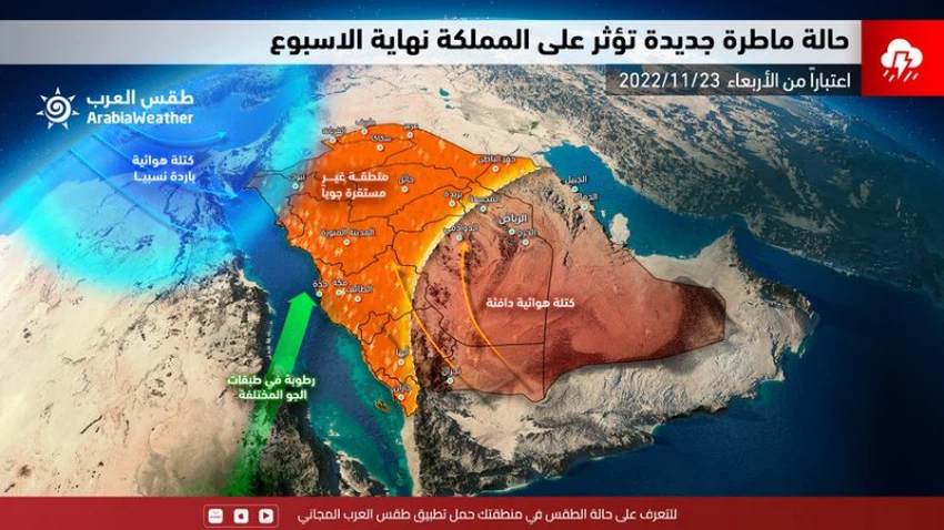طقس العرب - أفاد المُختصون في قسم العمليات الجوية في مركز طقس العرب الإقليمي للأرصاد والتنبؤات الجوية إلى توقعات بتأثر المملكة السعودية بحالة ماطرة جديدة اعتباراً من مساء الأربعاء 23-11-2022 و تستمر لِعدّة أيام بإذن الله. و بحسب المركز يُتوقع أن تشمل الحالة الماطرة أجزاء مُتفرقة من مناطق الحدود الشمالية و الجوف و تبوك و حائل و القصيم و المدينة المنورة و مكة المكرمة و حفر الباطن و جازان و عسير و الباحة. و كما هي العادة في مثل هذه الحالات تكون الأمطار غير مُنتظمة جغرافياً و تشمل مناطق دون الأخرى، و هذا لا يمنع ان تكون بعض المناطق معرضة لأمطار غزيرة و تساقط البرد لبعض الأوقات الأمر الذي يزيد من احتمالية جريان الأودية و الشعاب و رُبما تشكل السيول المفاجئة.
