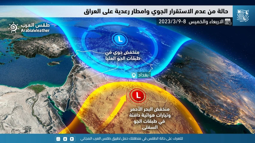 طقس العرب - تُشير الخرائط الجوية في مركز طقس العرب الإقليمي إلى تأثر العراق بحالة متوسطة إلى قوية من عدم الاستقرار الجوي يومي الأربعاء ناتجة عن التقاء كُتلة هوائية باردة في طبقات الجو العليا من الغلاف الجوي، مع امتداد سطحي لمُنخفض البحر الأحمر، ويؤدي هذا الإلتقاء إلى تكاثر السُحب الركامية الرعدية وهطول زخات رعدية من الأمطار على مناطق عِدة من البلاد.