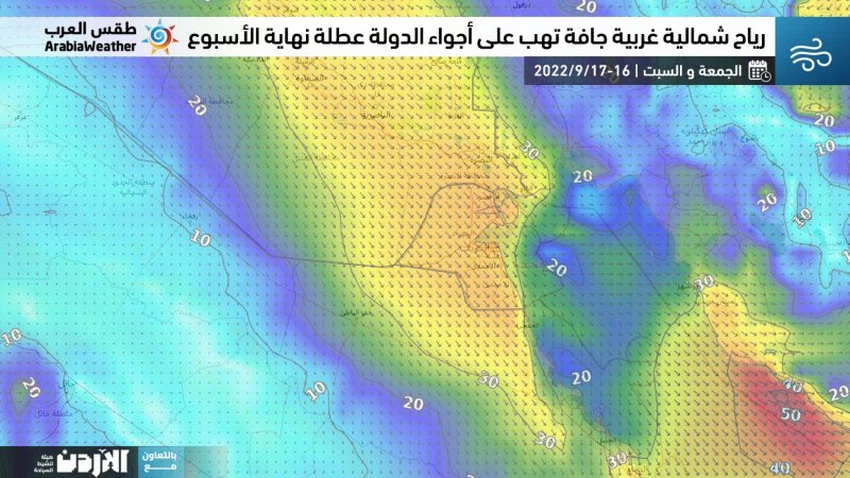 وفي التفاصيل، يكون الطقس صحواً في أغلب المناطق يومي الجمعة والسبت، و حاراً إلى شديد الحرارة وجافاً خلال ساعات النهار في عموم المناطق، كما يتجدد نشاط الرياح الشمالية الغربية، مُترافقة بِهبات قوية أحياناً تتجاوز حاجز 60 كم/الساعة تؤدي إلى ارتفاع نسب الغُبار في الأجواء خاصةً في المناطق الصحراوية و المكشوفة، الأمر الذي يؤدي إلى تدني في مدى الرؤية الأفقية.