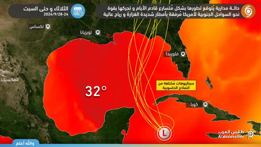 وتشير أحدث توقعات الخرائط الجوية المطورة داخل "طقس العرب"، والمتخصصة بتعقب حركة الأعاصير المدارية، إلى احتمالية كبيرة لتحول العاصفة المدارية إلى درجة إعصار مداري من الدرجات المتقدمة في وقت لاحق من نهاية الأسبوع الحالي، قبل وصوله إلى اليابسة في الولايات المتحدة الجنوبية مع تضارب توقعات النماذج العددية حول مسار العاصفة المدارية لغاية اللحظة.