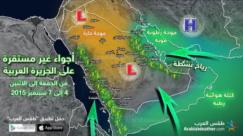 وقد أشار طقس العرب منذ عدة أيام الى سيطرة الاجواء غير المستقرة على المنطقة الشرقية من المملكة ودول الخليج اعتبارا من بداية الاسبوع الحالي لتشتد في منتصفه، وذلك نتيجة التدفق الكبير في الرطوبة الجوية وانخفاض الحرارة في الطبقات الجوية الاعلى، يؤدي ذلك الى عدم استقرار الطقس وتشكل السحب الرعدية واحتمالية تساقط زخات الامطار لكن وسط رطوبة مرتفعة جدا واجواء شديدة الحرارة.