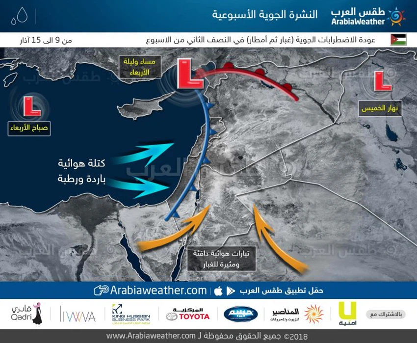 طقس العرب – م. ناصر حداد – يبدأ الأسبوع الحالي بأجواء مستقرة ولطيفة مع ساعات النهار، مع بقائها باردة ليلاً، أما في النصف الثاني من الأسبوع فتعود الاضطرابات الجوية من جديد (رياح نشطة واحتمال أمطار وتقلبات كبيرة في درجات الحرارة).