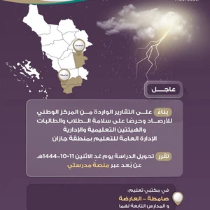 طقس العرب - قال متحدث تعليم جازان بسبب الأحوال الجوية السائدة والمُتوقعة غدًا الإثنين : بناءً على التقارير الواردة من المركز الوطني للأرصاد وحرصًا على سلامة الطلاب والطالبات والهيئتين التعليمية والإدارية، تقرر تحويل الدراسة يوم غدٍ الاثنين 11 شوال 1444هـ عن بُعد عبر منصة مدرستي في مكتبي تعليم صامطة والعارضة والمدارس التابعة لهما.