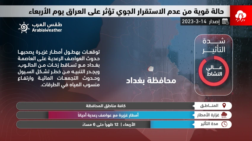ويُتوقع أن تتعرض العاصمة بغداد خلال ساعات مابعد ظهر الأربعاء حتى ساعات المساء لأحوال غير مُستقرة تتسم بالشدة وينتج عنها تكاثر كميات كبيرة من السُحب على ارتفاعات مختلفة، حيث تهطل زخات رعدية متفاوتة الشدة من الأمطار تكون الأمطار غزيرة للغاية أحياناً في بعض الأحياء ومصحوبة بزخات من البَرَد وحدوث العواصف الرعدية القوية، مما ينتج عنه ارتفاع منسوب المياه في بعض المُدن والأحياء وحدوث التجمعات المائية ورُبما تشكل السيول في الطرقات نتيجة للأمطار الرعدية.