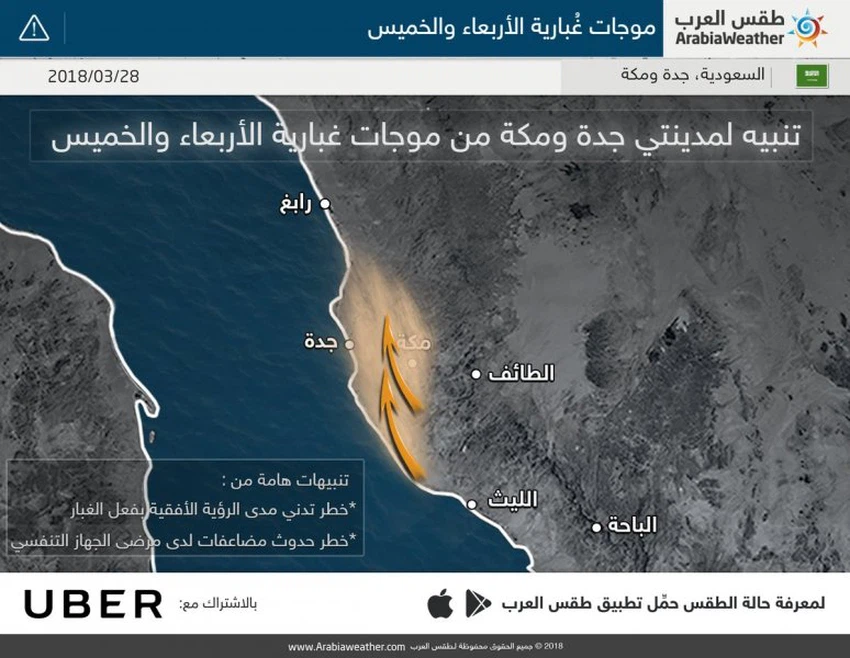 سنان خلف - تُشير آخر التوقعات الجوية الخاصة بطقس العرب إلى تأثر كُل من مدينة جدة ومكة المكرمة يومي الأربعاء والخميس بعواصف ترابية عمل على الحد من تدى الرؤية الأفقية بشكل لافت وملموس.