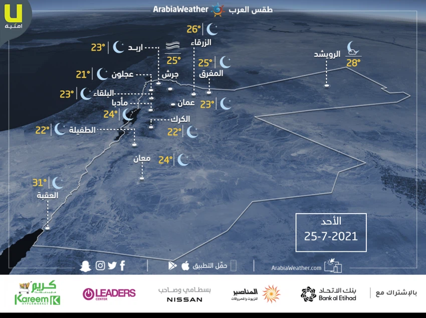 يتوقع ان ترتفع قليلا درجات الحرارة مقارنة بالليالي السابقة بحيث تسود أجواء لطيفة إلى معتدلة في الجبال والسهول، ودافئة في الأغوار والبحر الميت والعقبة والمناطق الشرقية، كما وترتفع نسب الرطوبة السطحية وتتشكل الغيوم المنخفضة خلال ساعات الصباح الباكر في شمال ووسط المملكة، ويتوقع ان تكون الرياح شمالية غربية خفيفة السرعة.