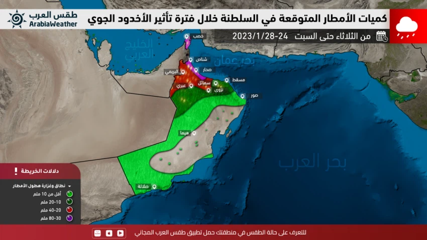 طقس العرب - قال مركز طقس العرب الإقليمي للأرصاد و التنبؤات الجوية بأنه يُتوقع أن تتأثر أجواء السلطنة تدريجياً اعتباراً من ساعات مساء الإثنين 23-1-2023 بأخدود من مُنخفض جوي و يستمر حتى يوم السبت القادم 28-1-2023 و يجلب الأمطار لأغلب مُحافظات السلطنة، و لكنه بشدة مُتفاوتة ما بين مُحافظة و أخرى، كما يشتد تأثيره تدريجياً و يبلغ ذروة تأثيره مع نهايات الأسبوع.