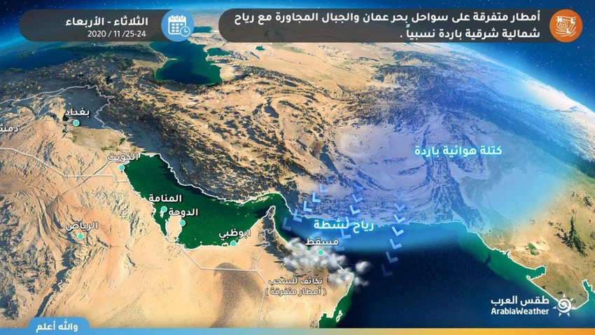 طقس العرب - يتوقع مع ساعات ليل اليوم ونهار الغد هطول زخات من الأمطار على سواحل بحر عُمان والجبال المجاورة وذلك بالتزامن مع هبوب رياح شمالية شرقية باردة نسبيًا