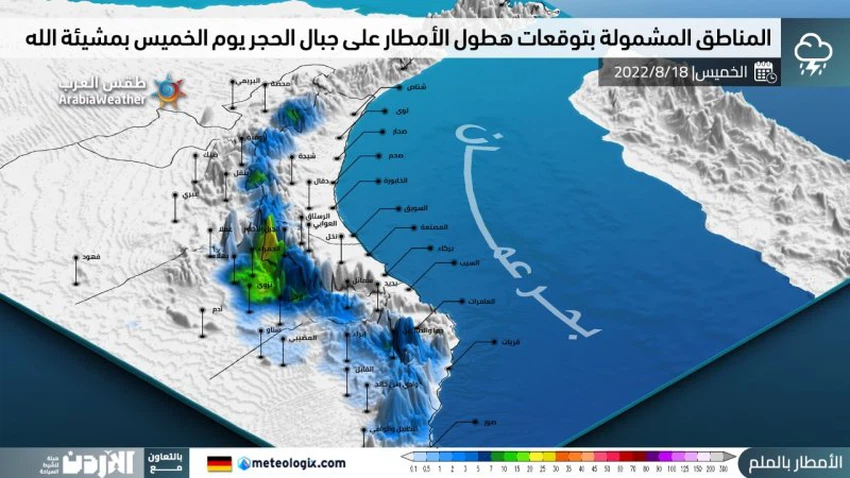 وبحسب مُخرجات النمذجة الحاسوبية فيُتوقع نشاط التكونات المحلية يوم الخميس 18-8-2022 على طول جبال الحجر مع تركزها على الحجر الأوسط، وتترافق السحب الركامية بهطول أمطار مُتفاوتة الغزارة تكون مصحوبة بِحُدوث العواصف الرعدية أحياناً ونشاط في الرياح الهابطة، وتؤدي إلى جريان الأودية والشِعاب في بعض الأحياء. وذلك بالتزامن مع تدفق كميات من السحب على ارتفاع عالية ومُتوسطة على أجزاء واسعة من مُحافظات السلطنة يتخللها سحب ركامية على أجزاء من محافظتي الوسطى وظفار تعمل على هطول زخات من الأمطار.