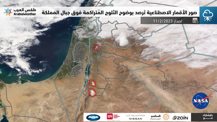 طقس العرب - رصدت صور الأقمار الإصطناعية يوم الجمعة 10/2/2023الثلوج وهي تغطي قمم محافظتي الكرك والطفيلة إضافةً إلى مرتفعات محافظتي جرش وعجلون كما هو في الخريطة أدناه.