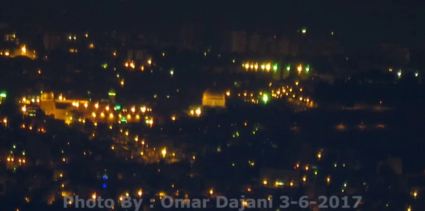 ولكن، ماذا لو علمتم أنه يُمكنكم مُشاهدة هذا المكان من بلدٍ آخر؟ الصور المُرفقة أعلاه تُظهر أضواء مدينة القدس، وقُبة الصخرة وجُزء من المسجد الأقصى، كما ظهرا الليلة الماضية من من منطقة جبل مكاور في مرتفعات مادبا في الأردن.