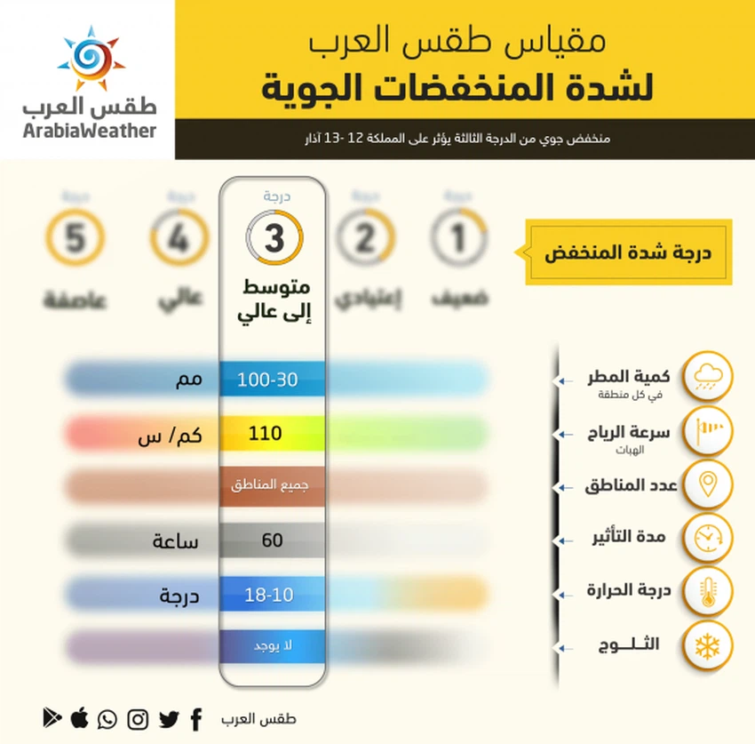 تفاصيل أكثر حول حالة الطقس والمنخفض الجوي نهاية الأسبوع عبر النشرة الرئيسية التي يقدمها المتنبئ الجوي محمد الشاكر من هنا  أو عبر الفيديو التالي