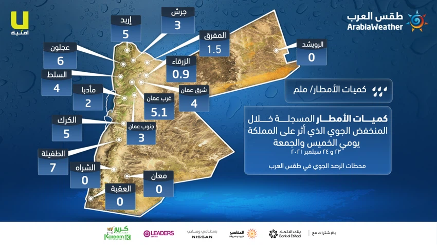 جدير بالذكر أن مُعدل هطول الأمطار في العاصمة عمان لشهر سبتمبر هو 0.3، وكميات الامطار الهاطلة من المنخفض الجوي على بعض مناطق العاصمة عمان، بلغت اضعاف مضاعفه من معدل هطول الأمطار في العاصمة عمان.