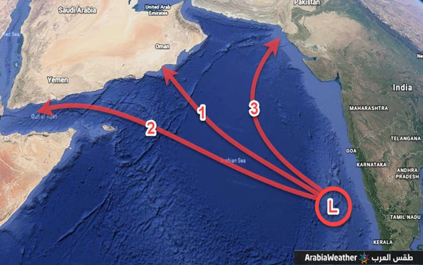 وتشير الخريطة المرفقة التالية الى احتمالات ومناطق تأثير النشاط الاستوائي المتوقع حيث تطرح النماذج العددية عدة سيناريوهات لحركة الاضطراب الاستوائي و يبدو ان المسار الاقوى (1) نحو سواحل عمان مع نهاية الاسبوع فيما المسار (3) هو الاقل احتمالية .