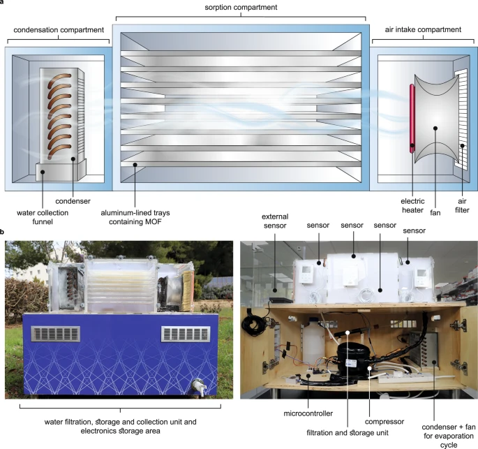وأضافت الجمعية ان الفريق بقيادة العالم الباحث كايل كوردوفا - المدير التنفيذي لقطاع البحث العلمي- والباحث حسام المساد وأعضاء الفريق البحثي قاموا بتصميم جهاز جديد لحصاد المياه من الغلاف الجوي من خلال التقاط وجمع الرطوبة بشكل انتقائي من الهواء المحيط وتكثيفها إلى ماء سائل.