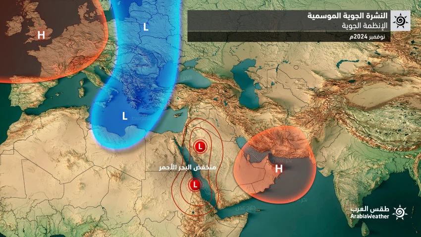 • يفصل بين ذلك، اقتراب احواض علوية باردة سواء من شمال غرب شبه الجزيرة العربية أو من شرق الجزيرة العربية تؤدي إلى حدوث حالات مُتباعدة من عدم الاستقرار الجوي و التي ترتفع وتيرتها أكثر بالاتجاه نحو النصف الثاني من نوفمبر و ديسمبر و لا يُستبعد أن يكون بعضاً منها مُتطرف.