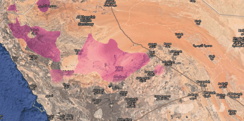 ويتوقع بمشيئة الله ان تهب رياح شمالية غربية نشطة الى قوية السرعة احيانا على شمال وغرب المملكة اعتبارا من صباح الجمعة ويوم السبت تصل هباتها الى حدود 70 كم/ساعة تعمل على اثارة الغبار وانخفاض مدى الرؤية الافقية. كما يُتوقع تشكل الصقيع في الكثير من المناطق خاصة الجبلية في تبوك والمرتفعات الجنوبية الغربية من المملكة.