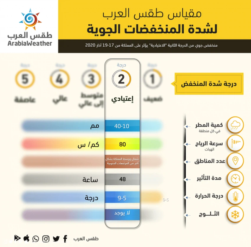 وحسب التحديثات الجوية الحالية، الصادرة صباح الأحد 15-آذار-2020، سيتبع هذا المنخفض الجوي الدرجة "الثانية" على مؤشر "طقس العرب" لتصنيف شدّة المنخفضات الجوية، والذي يمتد من الدرجة الأولى "الأضعف" وحتى الدرجة الخامسة "الأشد والاستثنائية"، أي بمعنى منخفض جوي "اعتيادي".