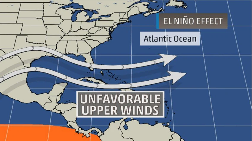 اذن وكما ذكرنا اعلاه فان لظاهرة النينو دورا رئيسيا في ضعف موسم الاعاصير في المحيط الاطلسي بالرغم من حرارة مياه المحيط الاطلسي الاعلى من معدلاتها العامة في المنطقة شبه الاستوائية، والتي تعتبر الوقود لتشغيل هذه الانظمة الاستوائية، لكنها غير قادرة على الاستفادة من هذه الحرارة بسبب قوة الرياح القاصة التي تدمرها بسرعة.