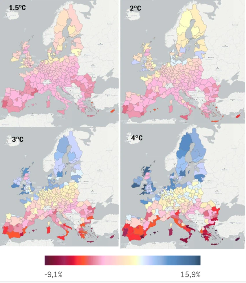وإذا ارتفعت درجات الحرارة لمستويات تتراوح ما بين 3 - 4 درجات مئوية، فان التأثير سيكون واضحاً جلياً على خريطة السياحة الأوروبية، بانخفاض أعداد السياح بنسبة 9.12٪ لجزر إيونية اليونان على سبيل المثال، وزيادة بنسبة 15.93٪ لغرب ويلز في المملكة المتحدة.