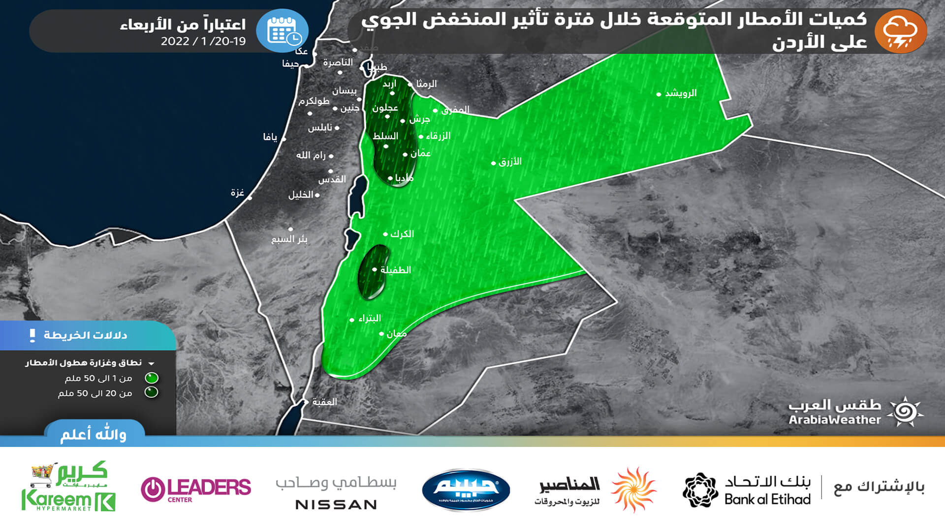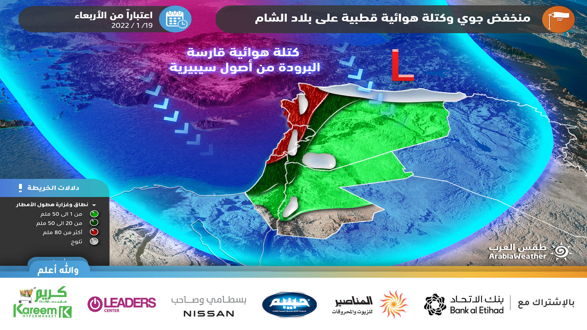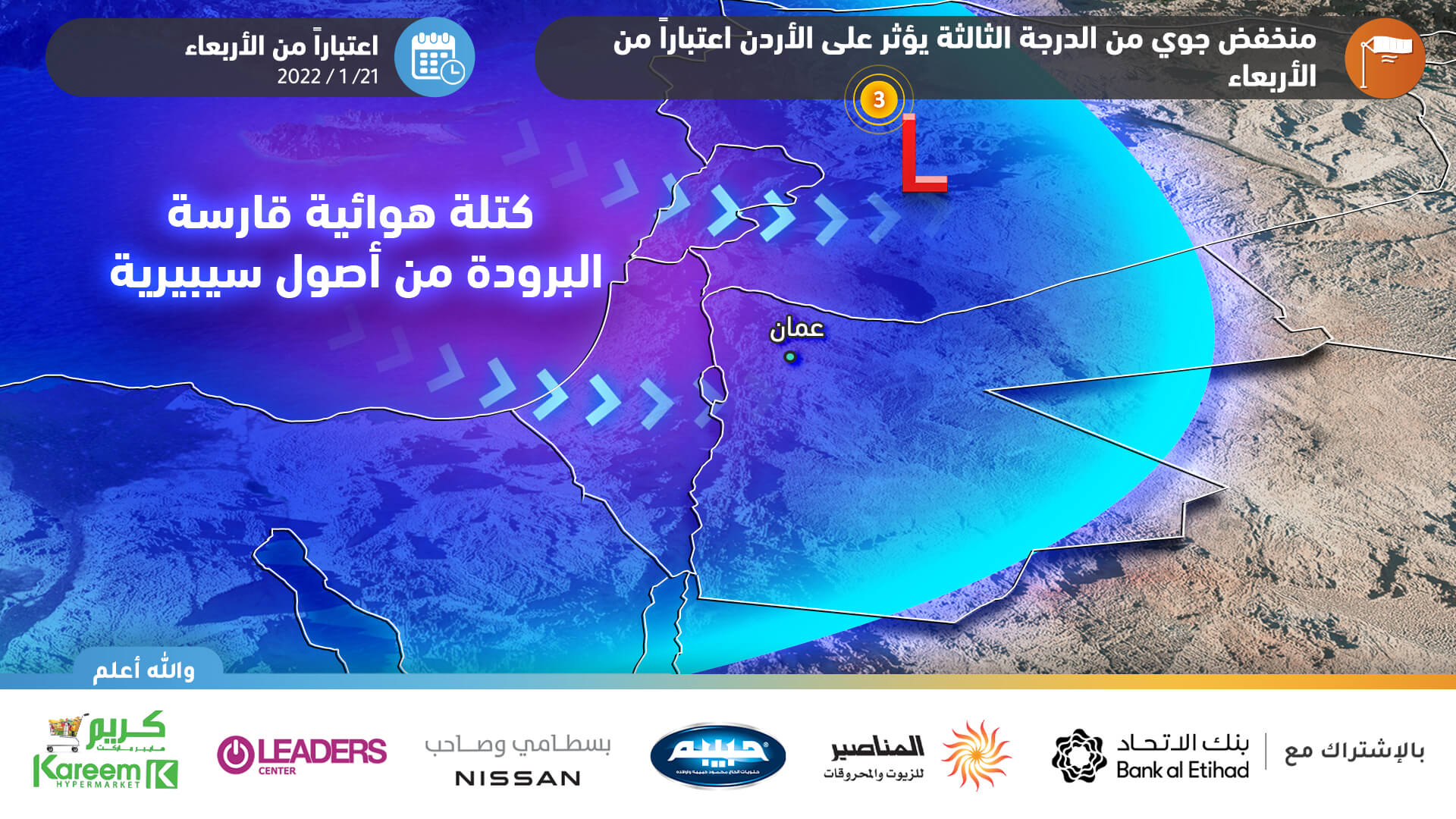 طقس العرب - قال مركز طقس العرب الإقليمي للأرصاد والتنبؤات الجوية بأن المملكة تتأثر يوم الأحد بمُنخفض جوي جديد مُصنف بأنه من الدرجة الثالثة ومُترافق مع جبهة هوائية باردة تعبُر المملكة تدريجياً أثناء النهار، وسيعقب تأثير المنخفض بمشيئة الله رياح قطبية المنشأ شديدة البرودة يتسبب ذلك بهبوط حاد على درجات الحرارة في أغلب الأنحاء كما ويتشكل انجماد واسع النطاق على الطرقات في عموم مناطق المملكة، بما فيها المدن الأردنية الرئيسية وذلك ليلة الأحد/الإثنين.