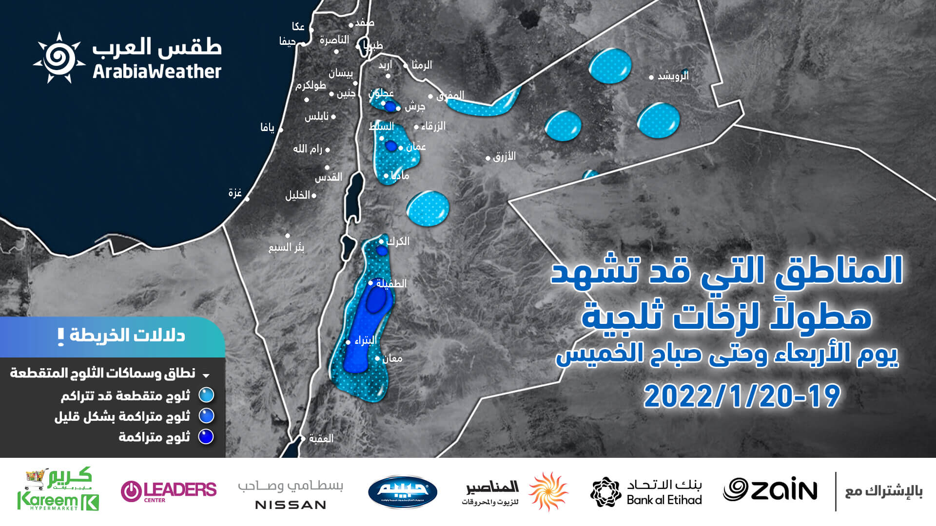 كما و يُتوقع تساقط الثلوج و تراكمها في مناطق البادية الجنوبية الشرقية بالإضافة إلى مُرتفعات الكرك و مُرتفعات الشراه و التي تشمل مرتفعات (الطفيلة و الشوبك و وادي موسى و مبرك و رأس النقب و قرى النعيمات وصولاً حتى مرتفعات رم). و يُحتمل هطول زخات ثلجية في نطاقات جغرافية ضيقة في باقي المناطق.