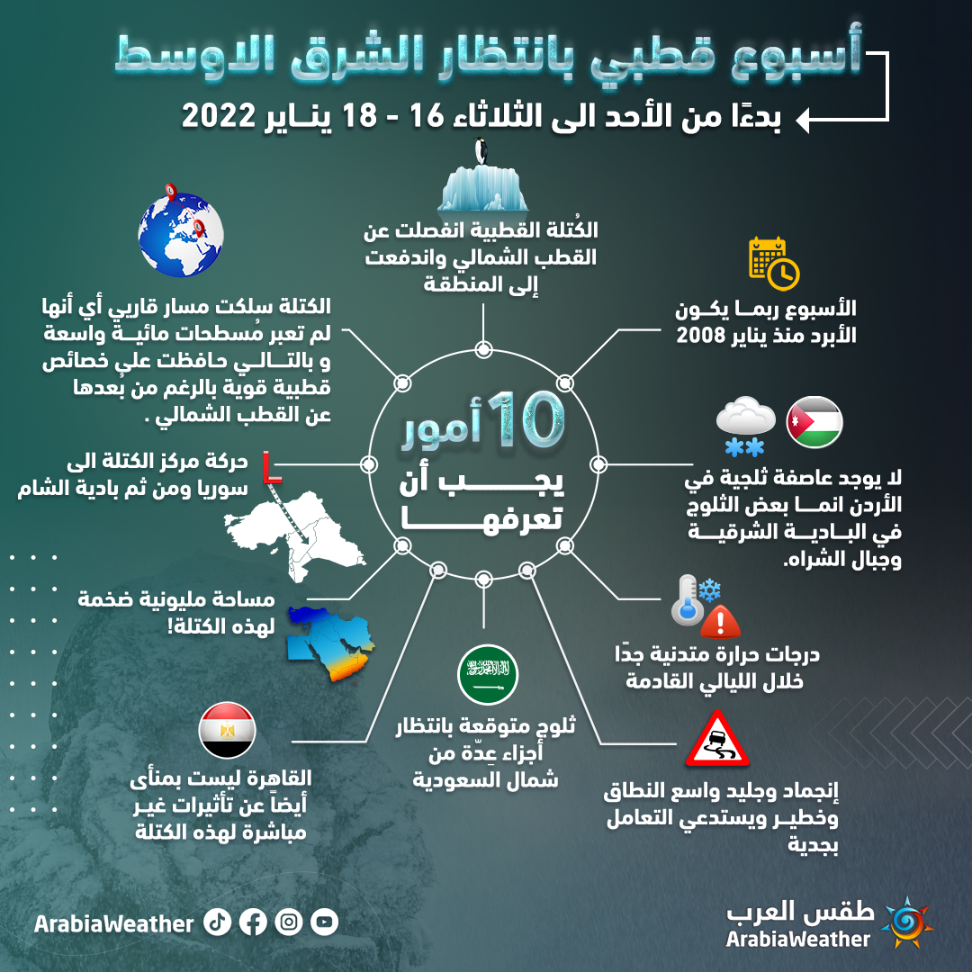 طقس العرب - بعد الموجة القطبية التي ستؤثر على الأردن بالاضافة إلى بلاد الشام والعراق وأجزاء من السعودية ومصر يومي الأحد والاثنين، موجة قطبية أخرى مشابهة للموجة السابقة تندفع نحو المنطقة بمشيئة الله يومي الاربعاء/ الخميس، تترافق بدرجات حرارة متدنية للغاية وأجواء قارسة البرودة مع تشكل الانجماد والصقيع في بعض المناطق.