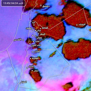 طقس العرب - تشير صور الأقمار الاصطناعية المطورة لدى مركز طقس العرب الإقليمي الى تكاثف للسُحب الركامية فوق مناطق مُختلفة من المملكة هذه الأثناء، وعلى إثر ذلك تشهد أجزاء من محافظة عجلون واجزاء من شرق محافظة اربد هطول زخات من الأمطار يرافقها الرعد أحياناً.