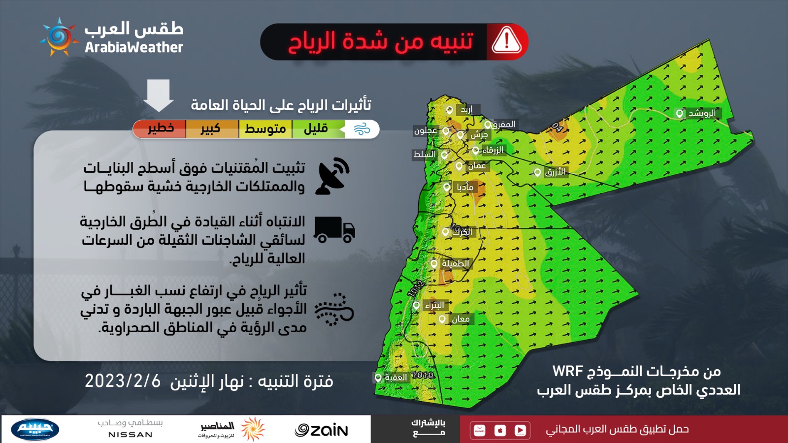 طقس العرب - صرح مدير ادارة الارصاد الجوية السيد رائد رافد آل خطاب بأن المملكة تأثرت منذ الساعات الأولى من صباح يوم الاثنين 06/02/2023 بمنخفض جوي عميق مصحوب بكتلة هوائية شديدة البرودة يرافقها رياح عاصفة تخللها هبات قوية احياناً تجاوزت سرعتها حاجز 105 كم/الساعة أدت الى حدوث العواصف الغبارية وتدني في مدى الرؤية الافقية وانعدامها احياناً خاصة في المناطق الصحراوية، كما شهدت المناطق الشمالية والوسطى من المملكة مع ساعات ما بعد الظهر سقوط زخات من المطر كانت غزيرة على فترات خاصة في ساعات الليل، فيما شهدت المرتفعات الشمالية والجنوبية والوسطى من المملكة والتي يزيد ارتفاعها 800 متر عن سطح البحر تساقط للثلوج وتراكمت بشكل متفاوت حسب الارتفاع .
