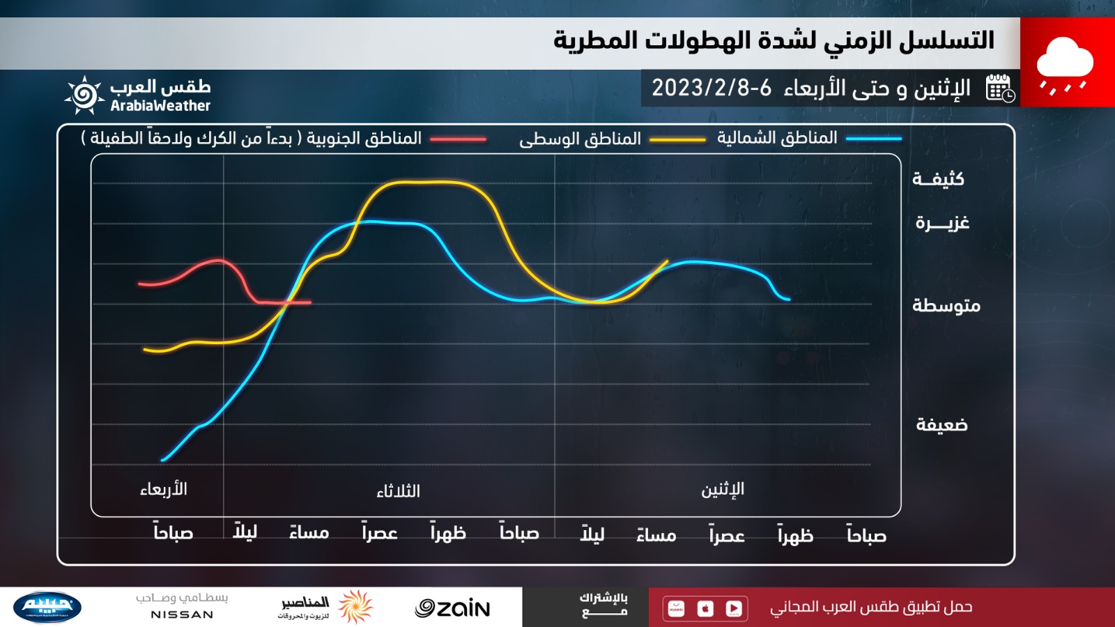 حيث تهطل زخات متفاوتة الشدة من الأمطار على شمال المملكة، تكون الأمطار غزيرة أحياناً ومصحوبة بزخات من البَرَد، ويُتوقع خلال الساعات القادمة ان تمتد الجبهة الهوائية ببطئ نحو المناطق الوسطى من المملكة بمافيها العاصمة عمان.