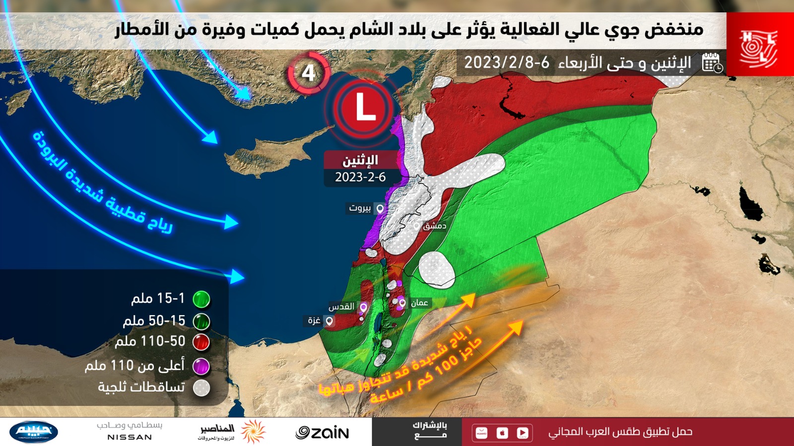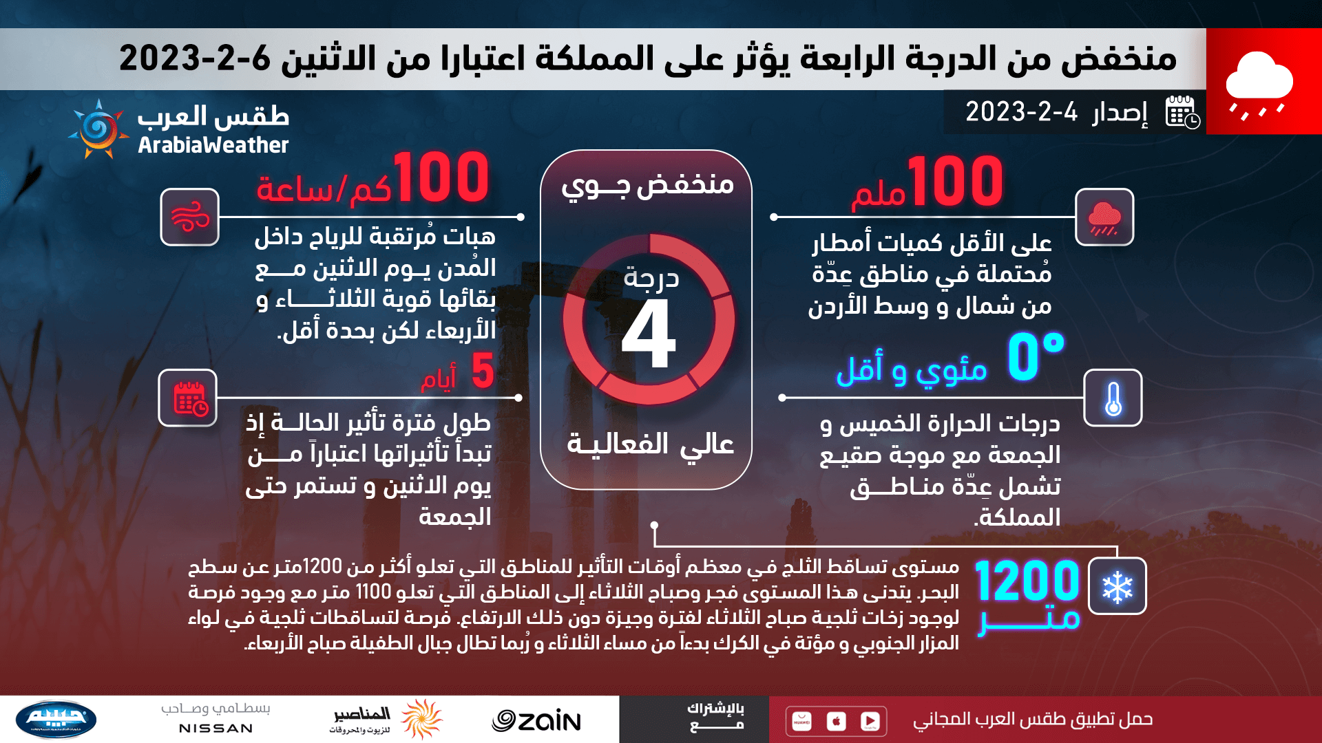 و تبين من خلال آخر المعلومات و البيانات المُحللة و المُستلمة في مركز طقس العرب بأن المنخفض الجوي القادم ارتفع تصنيفه إلى الدرجة الرابعة (عالي الفعالية)، و ذلك لِعدّة أسباب لعل من أهمها هو توقعات بهطول كميات كبيرة من الأمطار في أجزاء عِدّة من شمال و وسط المملكة تتجاوز حاجز 100 ملم في بعض المناطق مما سيؤدي إلى تشكل السيول و جريان الأودية و الشِعاب بالإضافة إلى ارتفاع منسوب المياه، بالإضافة إلى إنخفاض كبير مُتوقع في قيم الضغط الجوي في مركز المُنخفض الجوي الذي سيتسبب برياح عاتية و عاصفة تهب على المملكة خاصة نهار الاثنين، حيث تُشير نماذج المُحاكاة الحاسوبية إلى أن سرعة هبات الرياح ستتجاوز حاجز 100 كم/ساعة داخل المُدن و الأحياء يوم الإثنين و تستمر الرياح الثلاثاء و الأربعاء بهبات قوية لكنها أقل شدة مما سيكون عليه الحال يوم الاثنين. كما تُشير ذات نتائج المُحاكاة العددية إلى أن هُناك توقعات بتساقط الثلوج فوق المُرتفعات الجبلية العالية التي يعلو ارتفاعها عن 1200 متر عن سطح البحر و التي تشمل أعالي جبال جرش و عجلون، مع توقعات بامتدادها مؤقتاً للمناطق التي تقل عن هذا الارتفاع لبعض الأوقات.