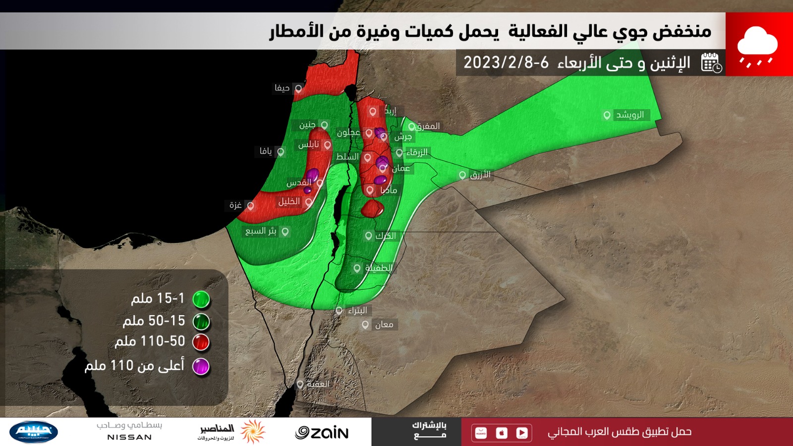 طقس العرب - تتأثر المملكة الاردنية بمنخفض جوي مصنف من الدرجة الرابعة اعتبارًا من نهار يوم الإثنين ويمتد حتى عدّة أيام ، تكاد تكون ميزته الأبرز كميات الأمطار الكبيرة المتوقعة خلال تأثيره .