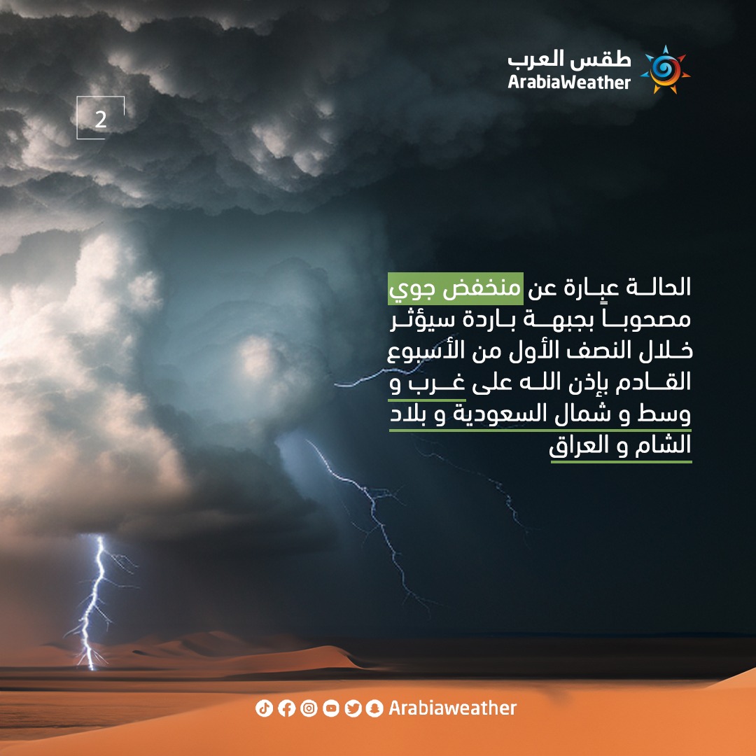 و يُتوقع بمشيئة الله أن تتكاثر تدريجياً مع مُرور ساعات النهار من يوم الثلاثاء كميات من السُحب على ارتفاعات مُختلفة على أنحاء عشوائية من المملكة، و التي تُصبح ركامية فترة ما بعد الظهر و المساء و خاصة على المناطق الشرقية و الجنوبية الشرقية من المملكة و يُرافقها هطول زخات رعدية من الأمطار و تكون بعض من هذه الزخات غزيرة في بعض الأحياء و النطاقات الجغرافية و تترافق مع تساقط البَرَد مما قد يتسبب بتشكل ما يُسمى بالسيول المُفاجئة في المناطق المنخفضة و المُنحدرات و الأودية و الشِعاب و يشمل ذلك مناطق عِدّة من البادية.