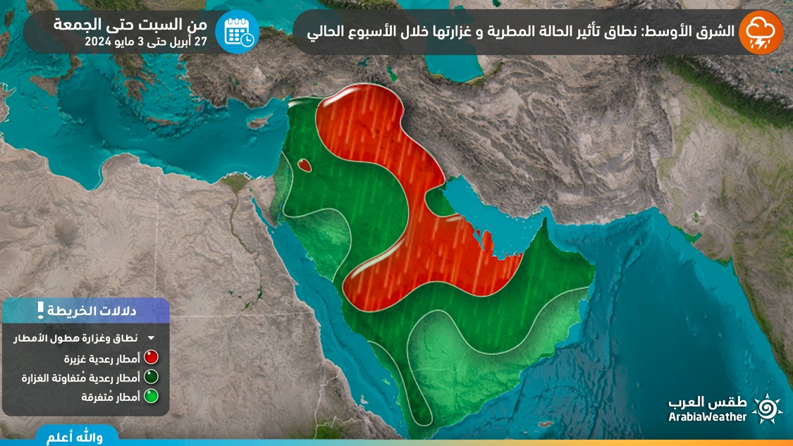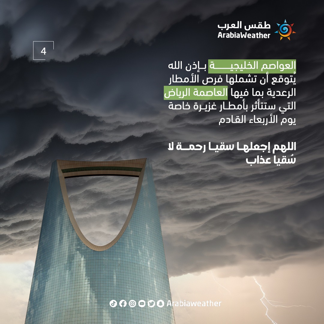 و بناءً على ذلك، يُتوقع بمشيئة الله أن تتكاثر السحب على ارتفاعات مُختلفة ساعات ما بعد الظهر في أنحاء عِدّة من المملكة و تهطل زخات أمطار متفاوتة الشدة في أجزاء عشوائية من المملكة إلا أنها تتركز في المناطق الجنوبية و الشرقية، ولا يُستبعد أن تكون هذه الأمطار غزيرة أحياناً ومُترافقة بزخات البَرَد، ما يرفع من احتمالية جريان الأودية والسيول و يشمل ذلك أنحاء عديدة من مناطق البادية.