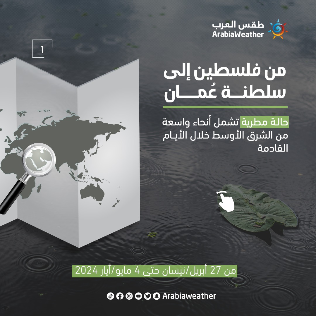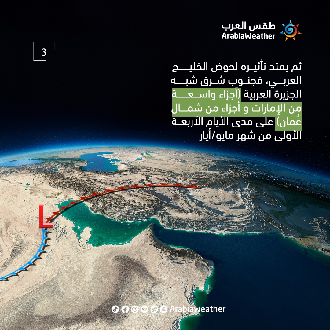 يُراقب كادر التنبؤآت الجوية في طقس العرب تتابُع المؤشرات على حدوث تغيرات جذرية في الأنظمة الجوية لصالح منطقة بلاد الشام وعُموم دول الخليج العربي، ويُتوقع أن تعمل على نشوء أحوال جوية غير مستقرة، تتميز بتأثيرها الواسع وطولها زمنياً، في الفترة الممتدة من 26 أبريل / نيسان وحتى 5 مايو / أيار المُقبل.