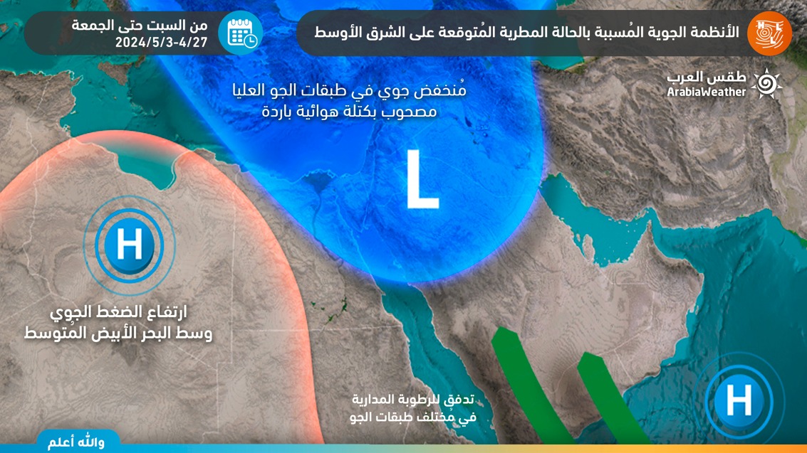 من مركز طقس العرب الإقليمي - تُشير أحدث القراءات الجوية توقعات بأن يتسع نطاق تأثير الحالة المطرية خلال الأيام القادمة على دول المشرق العربي و التي بدأ تأثيرها بالفعل اليوم السبت على الأجزاء الغربية من المملكة السعودية و الأردن. و تنتج هذه الحالة الجوية بسبب اندفاع مُنخفض جوي في طبقات الجو العالية لشمال شبه الجزيرة العربية و يُراوح مكانه في هذه تلك المنطقة لِعدّة أيام و مصحوب بجبهة هوائية باردة، بالتزامن مع حدوث التسخين النهاري و هو عامل رفع مساند للسُحب الركامية مُتوقع بعد الظهيرة بمعيّة منخفض جوي سطحي و تدفق للرطوبة المدارية نحو المنطقة.