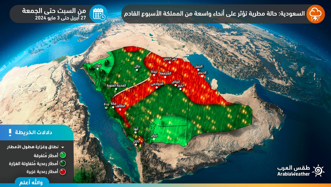 وتشير آخر مخرجات الخرائط الجوية، إلى اتساع رقعة الأمطار خلال الساعات القادمة خاصة مع ساعات الظهر والعصر لتشمل أجزاء من غرب و وسط و وشرق وشمال المملكة وتشمل بذلك مكة المكرمة و المدينة المنورة و حائل و القصيم و مُحافظات شمال وشمال غرب منطقة الرياض إدارياً وشمال المنطقة الشرقية والحدود الشمالية و تترافق بهطول أمطار مُتفاوتة الغزارة مصحوبة بحدوث العواصف الرعدية و تساقط البَرَديات مما يؤدي إلى جريان كبير للأودية و الشِعاب و تشكل السيول في بعض المناطق.