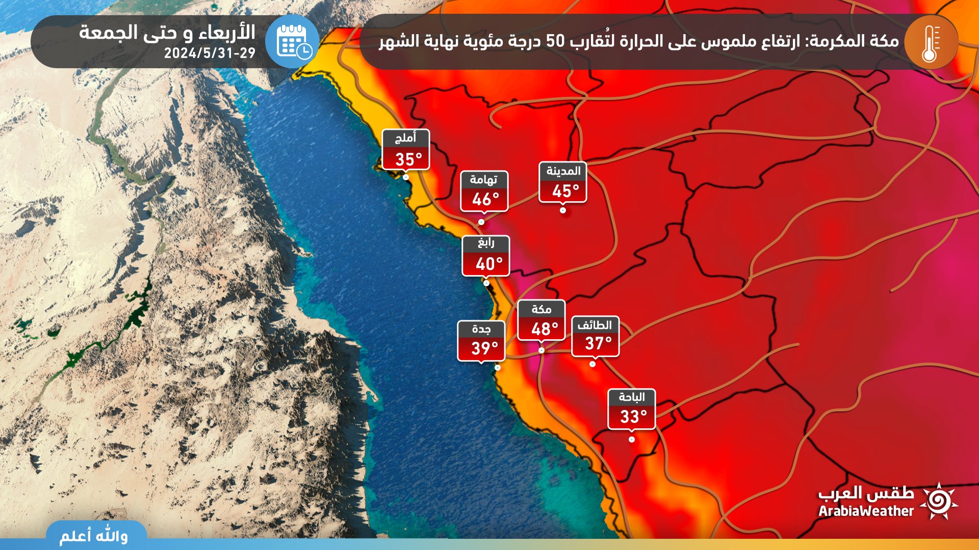 طقس العرب - قال المُختصون الجويون في مركز طقس العرب الإقليمي بأن آخر مُخرجات النماذج الحاسوبية تُشير إلى تأثر الإمارات مع آخر أيام شهر مايو ومطلع حزيران بموجة حارة ناتجة عن اشتداد المُرتفع الجوي العربي مما يعمل على تأجيج ظاهرة القُبة الحرارية والتي ترافقها كُتلة هوائية ذات تسخين سطحي مُرتفع تعمل على رفع درجات الحرارة لقرابة ال50 مئوية خاصة في المناطق الجنوبية والصحراوية.