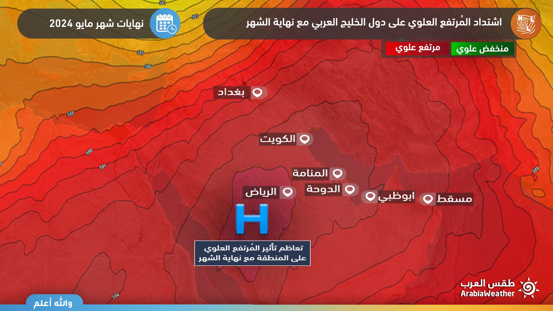 من مركز طقس العرب - تُشير آخر القراءات الجوية في مركز طقس العرب توقعات بأن تتأثر أنحاء واسعة من شبه الجزيرة العربية خلال الأيام الأخيرة من شهر مايو بما فيها العراق و الكويت و قطر و البحرين و المملكة السعودية و الإمارات و سلطنة عُمان بموجة حارة بسبب تأثير القبة الحرارية نتاج اشتداد المُرتفع الجوي العلوي.