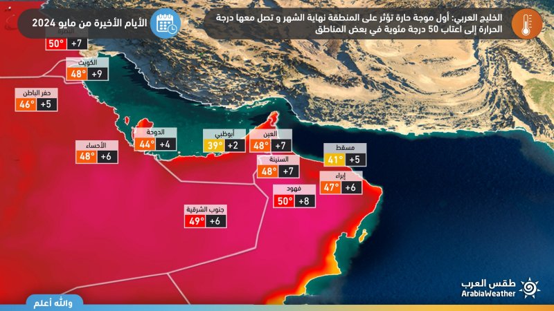 طقس العرب - يُتوقع بمشيئة الله أن تتأثر دول الخليج العربي مع الأيام الأخيرة من شهر مايو و مطلع يونيو بأول موجة حارة لهذا الموسم، و تتسبب بارتفاع ملموس على درجات الحرارة و تُصبح بذلك أعلى من مُعدلاتها بأكثر من 5-8 درجات مئوية، كما و تصل إلى عتبة الـ 50 درجة مئوية في بعض المناطق.
