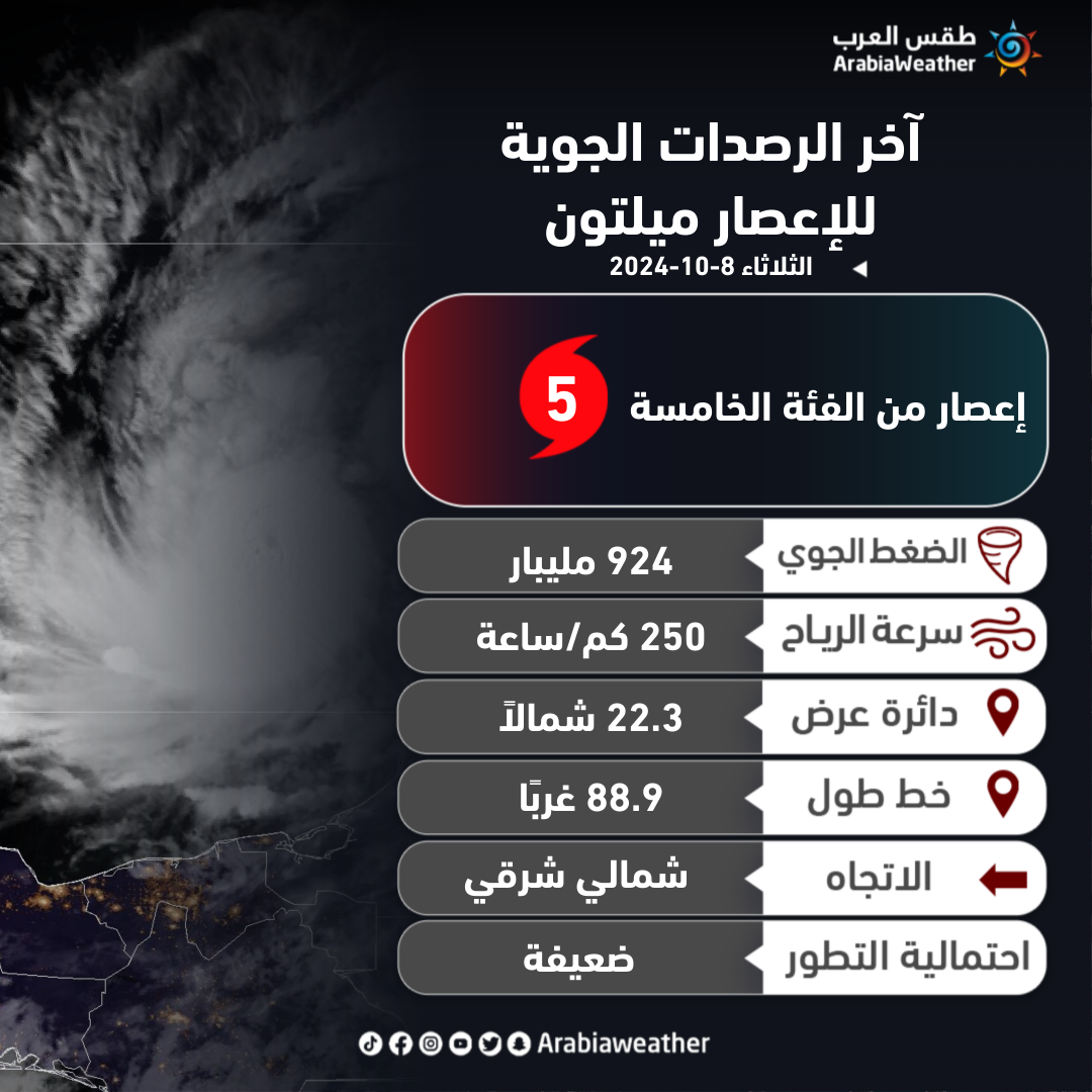 وتالياً أحدث الرصدات الجوية الواردة لدى طقس العرب للإعصار ميلتون :