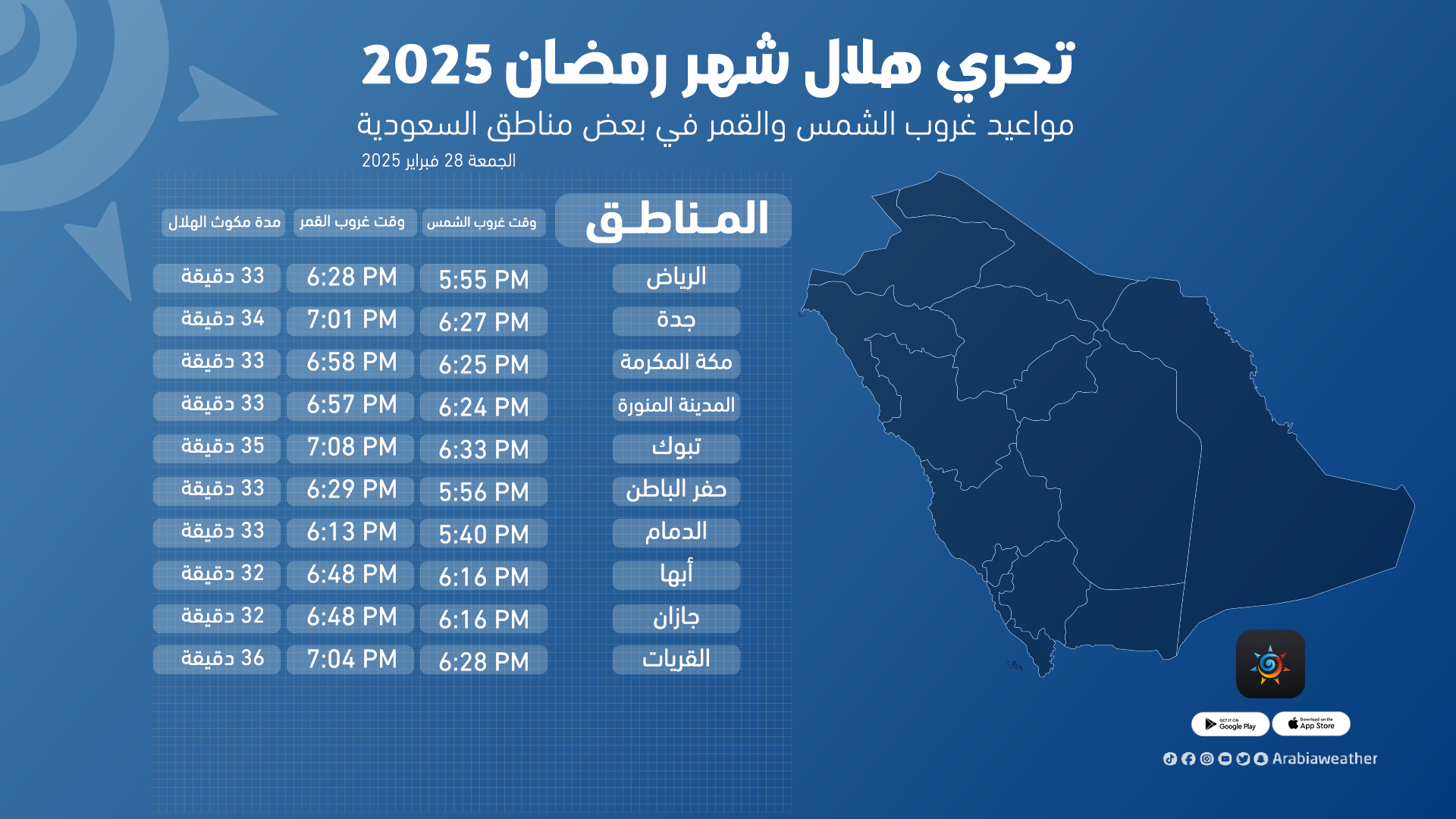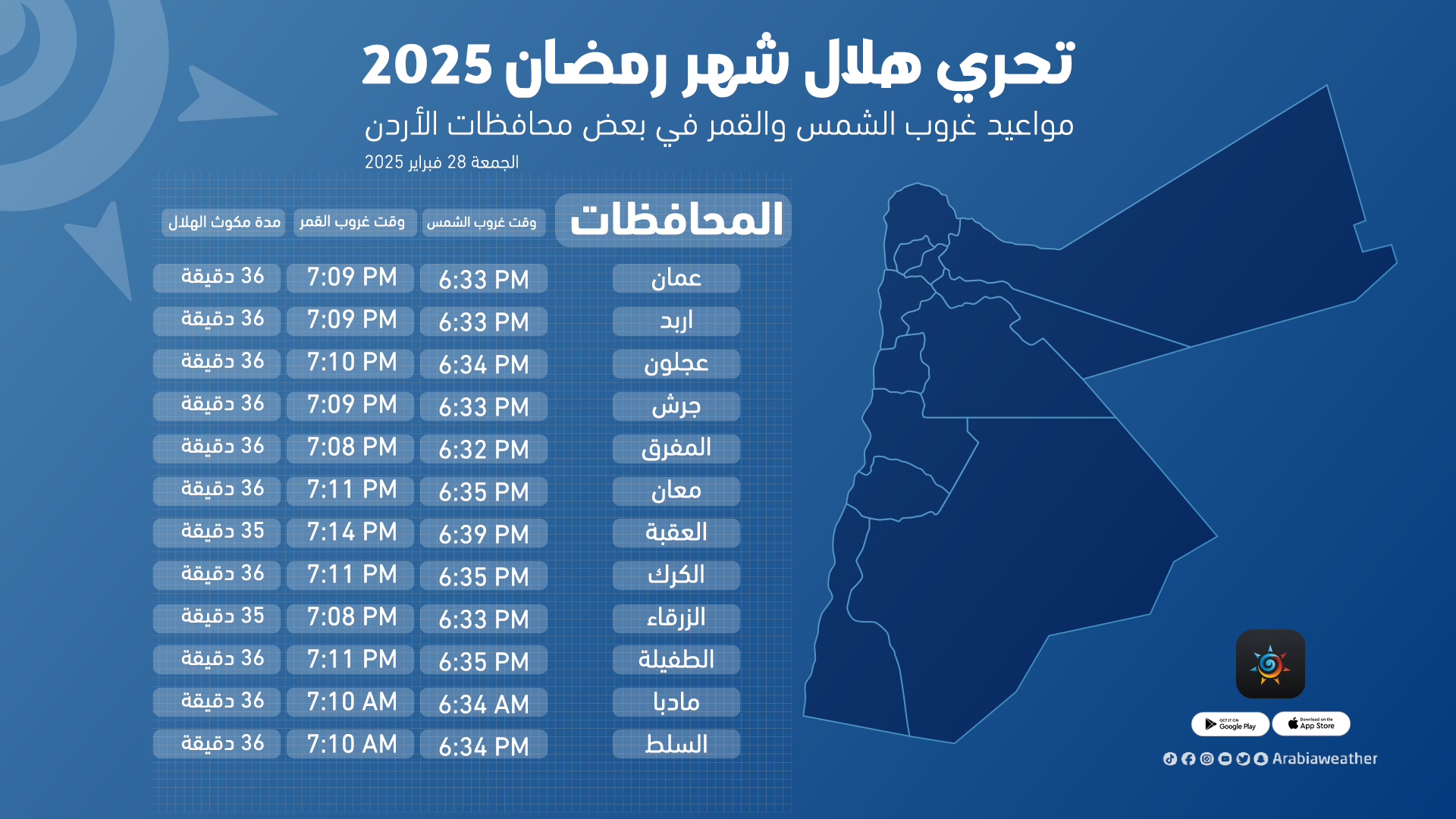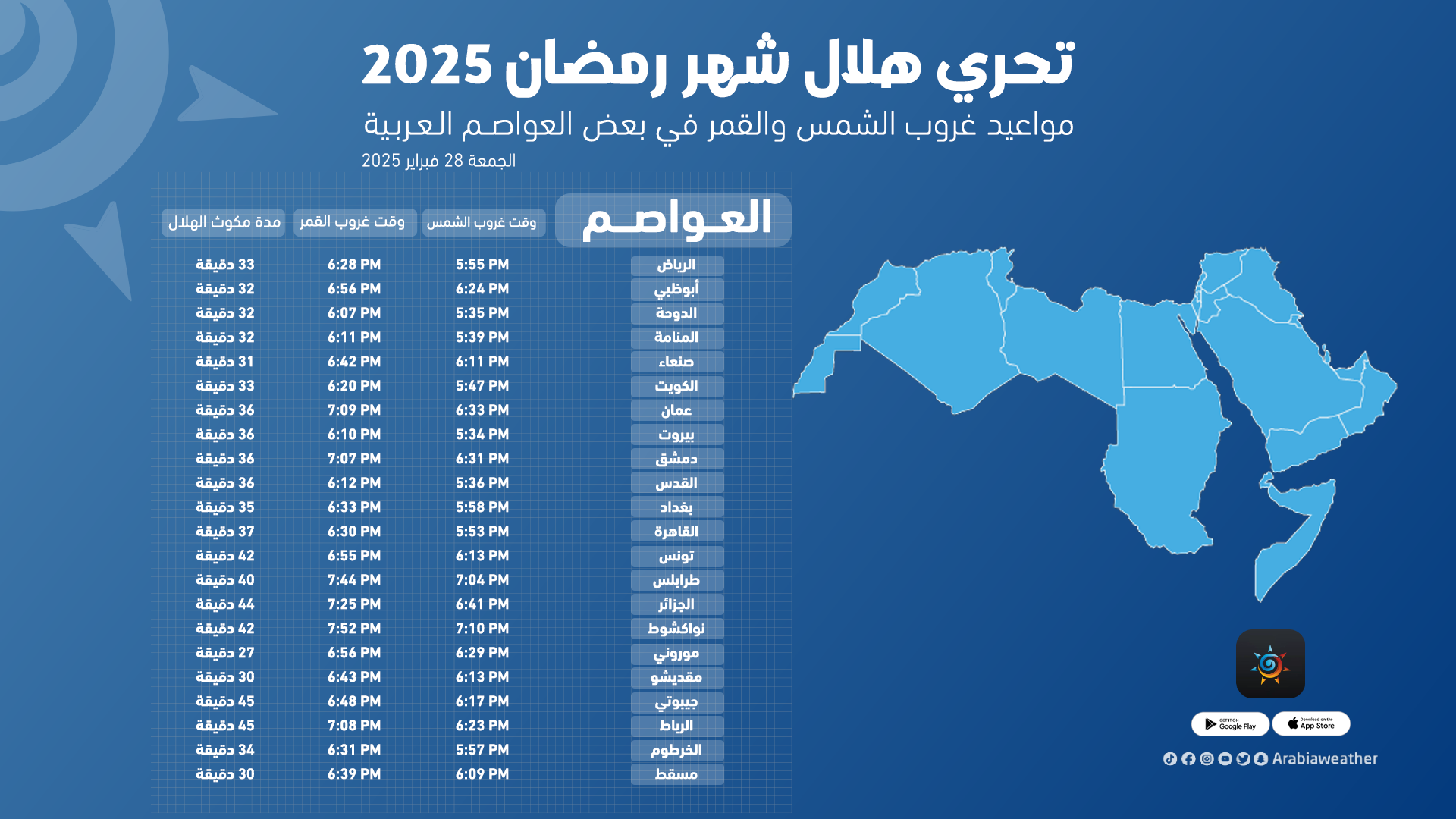 وفيما يلي أوقات غروب الشمس وغروب القمر وفترة مكوث القمر في الأفق بعد الغروب في بعض مناطق الأردن والسعودية والعواصم العربية: