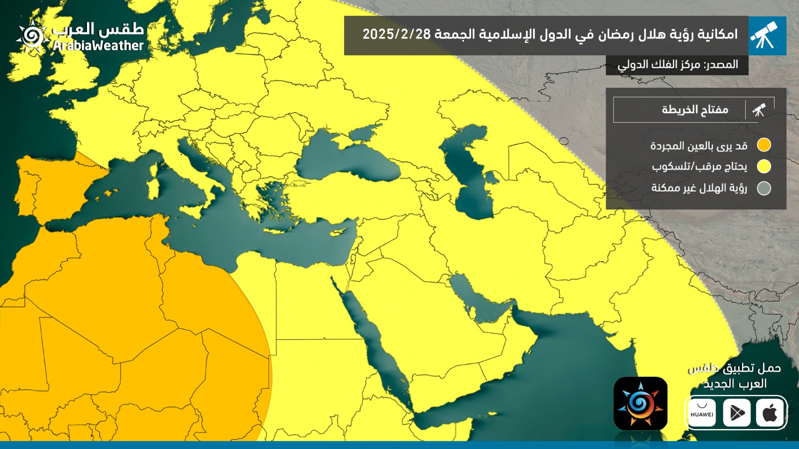 طقس العرب-يترقب المسلمين في مختلف أنحاء العالم تحري هلال شهر رمضان المبارك لعام 1446 هـ مساء الجمعة 28 فبراير/شباط 2025 (الموافق 29 شعبان 1446 هـ)، لتحديد موعد بداية الشهر الفضيل.