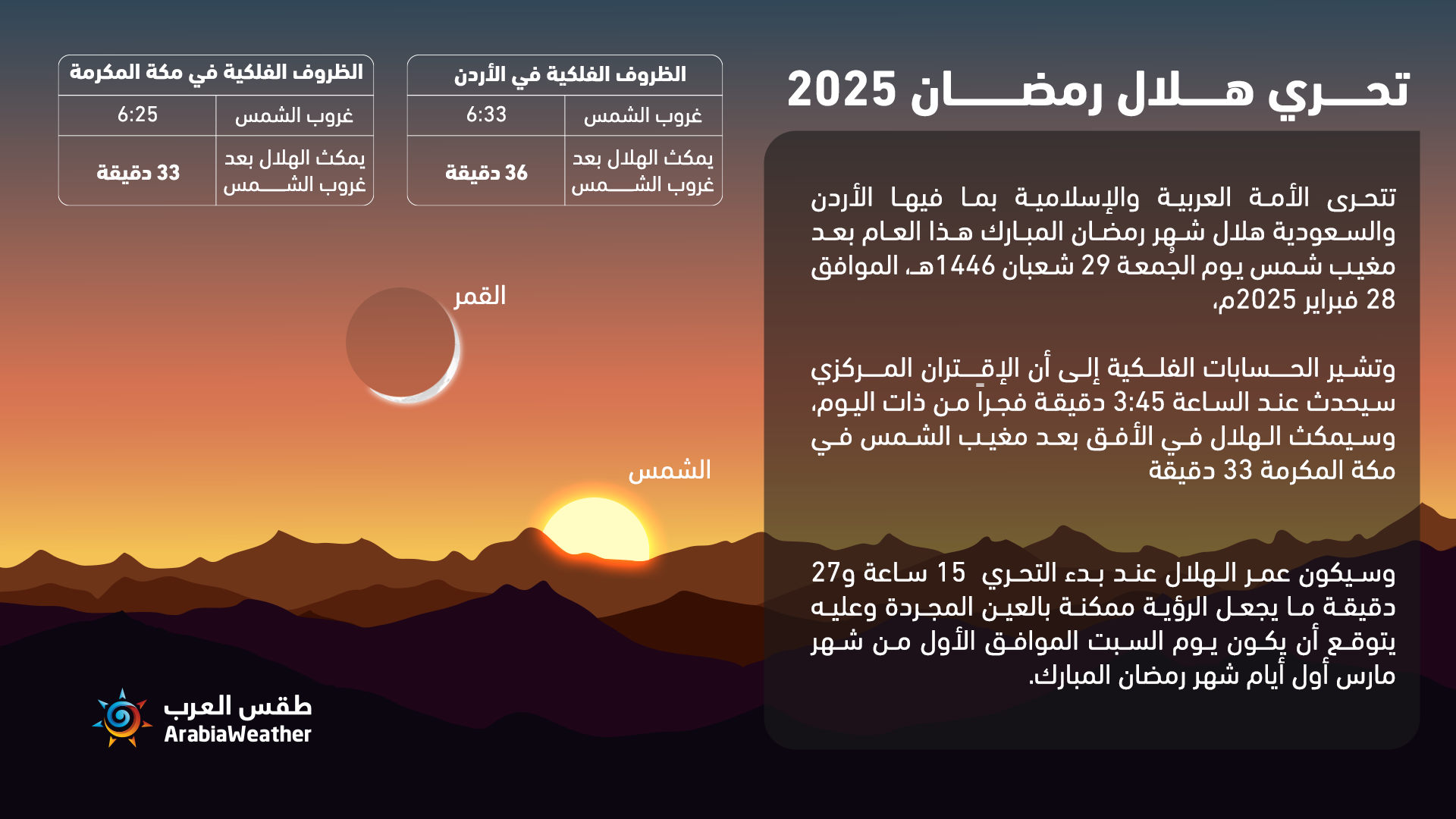 طقس العرب - تتحرى الأمة العربية والإسلامية بما فيها الأردن والسعودية هلال شهر رمضان هذا العام بعد مغيب شمس يوم الجُمعة 29 شعبان 1446هـ، الموافق 28 فبراير 2025م.
