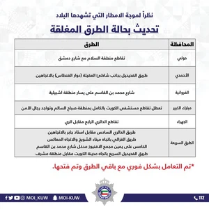 طقس العرب - نظراً لموجة الامطار التي تشهدها دولة الكويت وما نتج عنها من تجمعات للمياه في بعض المناطق، قامت الإدارة العامة للمرور بإغلاق بعض الطرق الرئيسية والفرعية مؤقتاً وذلك لإتاحة الفرصة للجهات المعنية بإزالة تجمعات المياه، مهيباً بالجميع توخـي الحيطـة والحـذر واتباع إرشـادات رجـال الأمـن حفاظاً على سلامة الجميع، وفيما يلي تحديث بالطرق المغلقة: