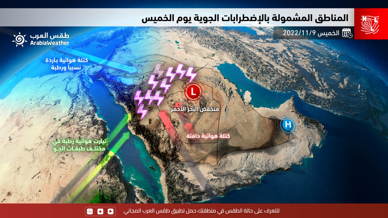 حالة جوية متوقعة من عدم الاستقرار تؤثر على المملكة اعتبارًا من يوم الخميس و تشمل مناطق واسعة من الممكلة خاصة على غرب ووسط وشمال شرق المملكة حيث تتهيأ الفرص بداية من ساعات الظهر والعصر لهطول زخات رعدية من المطر تكون متفاوتة الشدة خاصة على مناطق شرق المدينة المنورة وعلى اجزاء من حائل والقصيم وشمال منطقة الرياض ادارياً واجزاء من شمال شرق المملكة كما يُتوقع ان تترافق تلك السحب الرعدية بهبوب الرياح الهابطة والتي تعمل على اثارة الغبار والاتربة بشكل كثيف ولكن يكون مؤقت خاصة على المناطق السابق ذكرها.