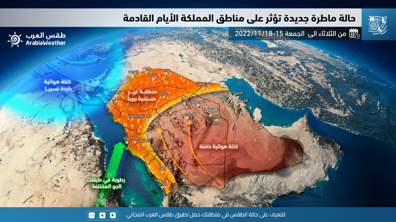 تتأثر المملكة بحالة ماطرة جديدة اعتباراً من يوم الثلاثاء 15-11-2022 و تستمر لِعدّة أيام و تشمل تأثيراتها مناطق الحدود الشمالية و حائل و القصيم و المدينة المنورة و حفر الباطن و أجزاء مُتفرقة من الجوف و تبوك و المُرتفعات الجنوبية الغربية بما في ذلك العاصمة المقدسة، وتكون الأمطار متفاوتة الغزارة و مصحوبة بحدوث الرعد و تساقط البَرَد أحياناً.